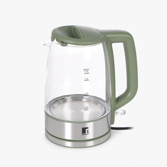 Ajoutez une touche de modernité et d’efficacité à votre cuisine avec la bouilloire électrique BERGNER 1.7L, un indispensable du quotidien pour les amateurs de thé, café ou cuisine rapide. Dotée d’un design épuré avec un corps en verre transparent et des finitions en inox brossé et vert olive, elle allie esthétique, praticité et performance.