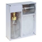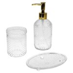 Apportez une touche de luxe discret à votre salle de bain avec ce set 3 pièces en verre transparent texturé, à la fois pratique et raffiné. Son design moderne avec finitions en relief et pompe dorée s’intègre parfaitement à tout style de décoration intérieure.