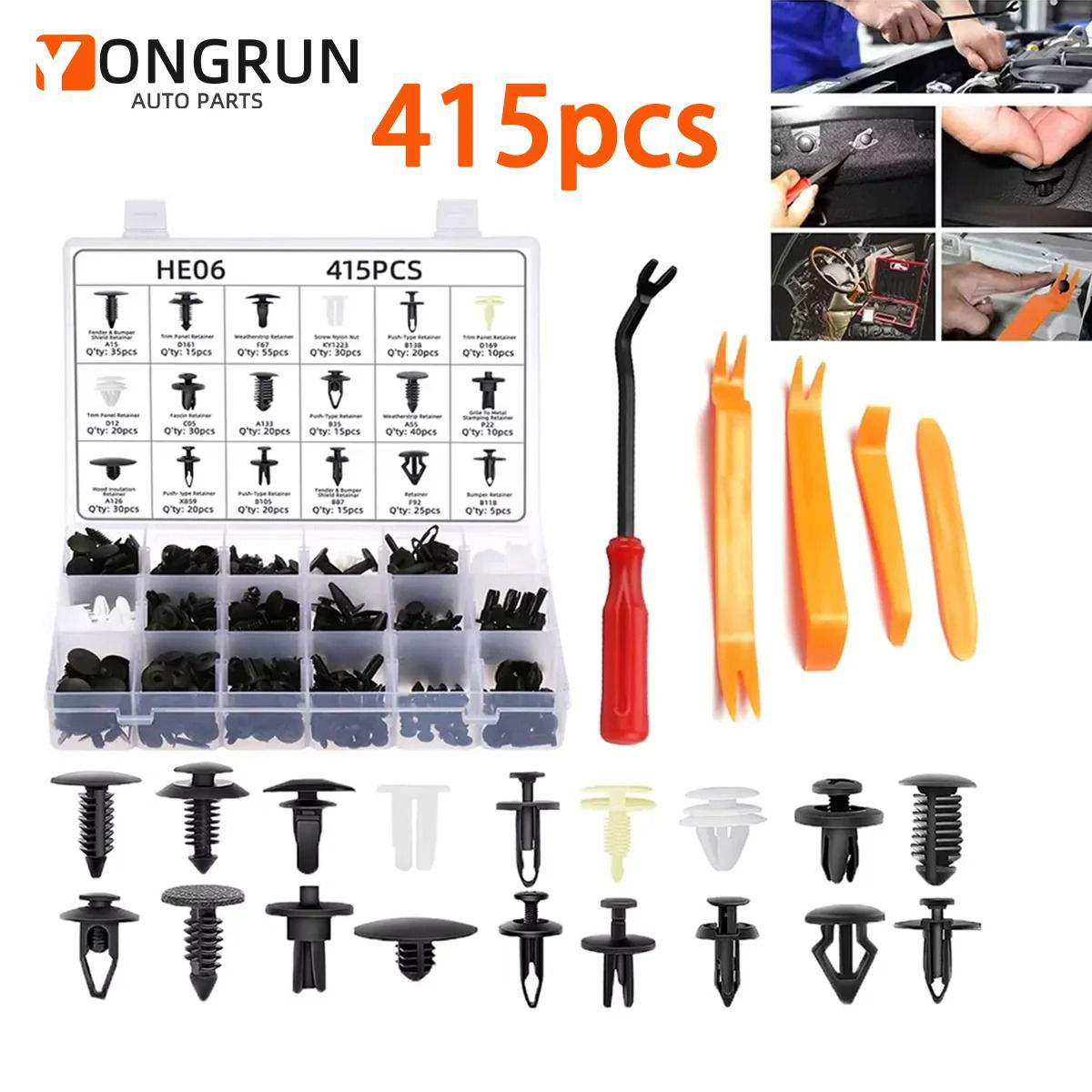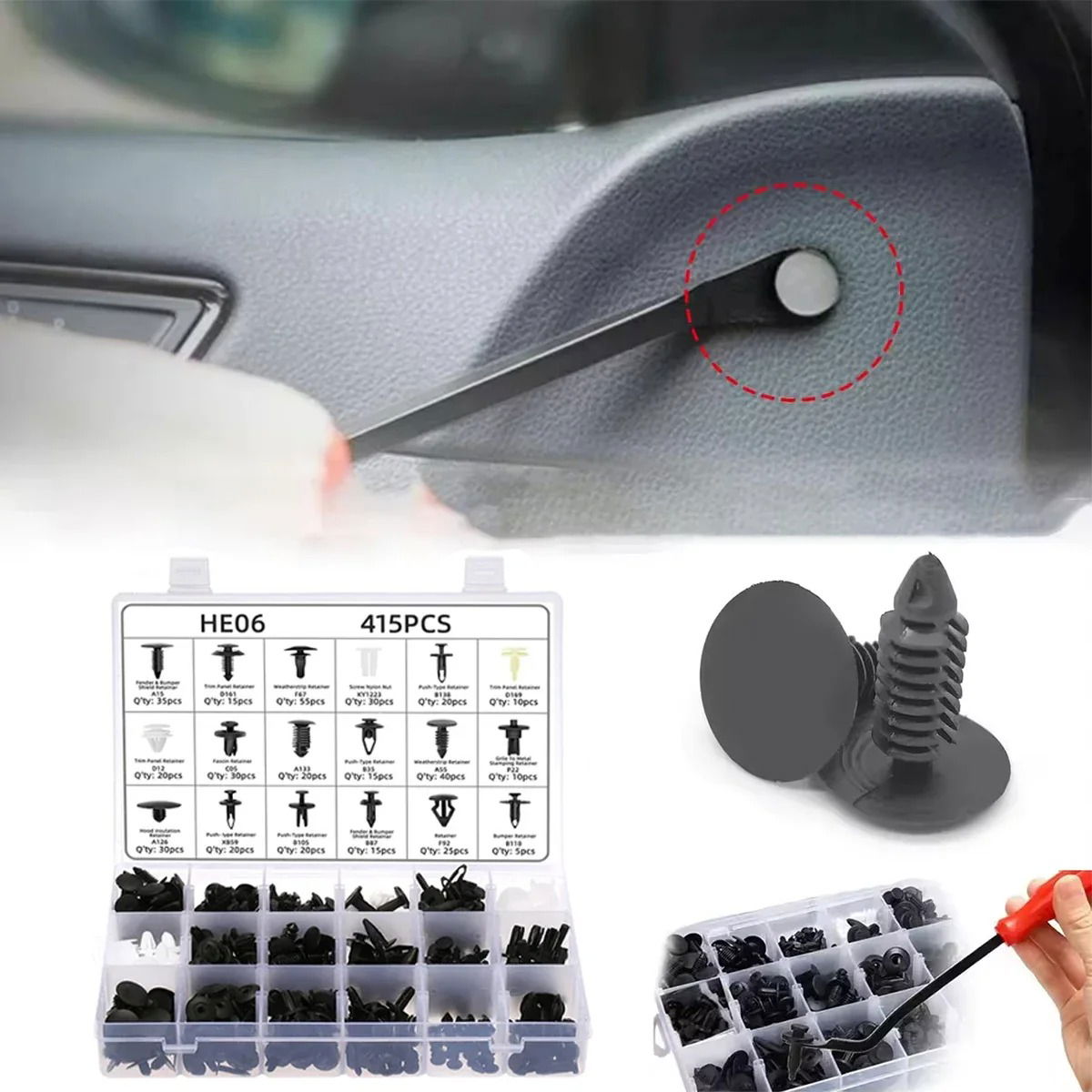 Ce coffret complet de 415 agrafes de fixation auto + 1 outil d’extraction est l’indispensable de tout amateur ou professionnel de l’entretien automobile. Il contient 18 types différents de clips compatibles avec la plupart des marques de véhicules (Toyota, Honda, Ford, Nissan, Mazda, Audi, BMW, Mercedes, etc.).