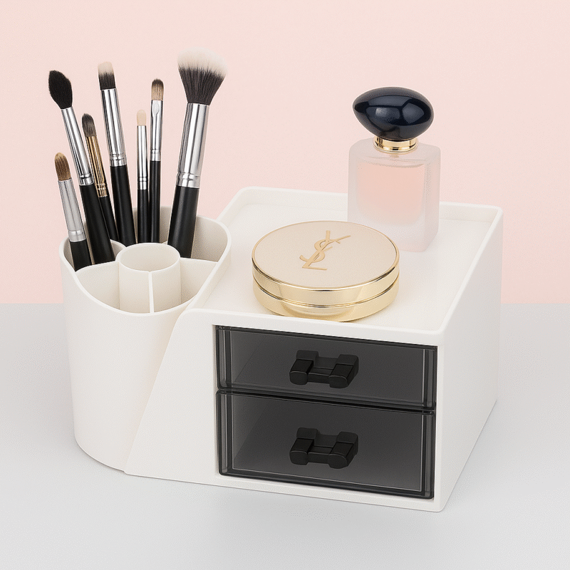 🗃️ Tiroirs transparents : 2 tiroirs spacieux pour organiser fards à paupières, rouges à lèvres, éponges ou bijoux tout en gardant une visibilité optimale.