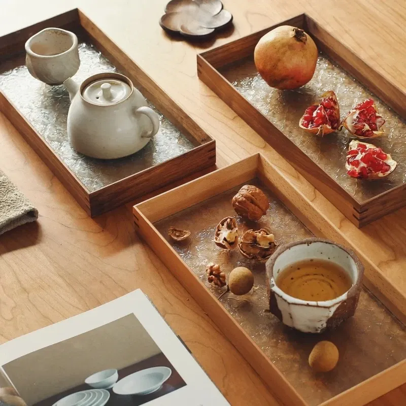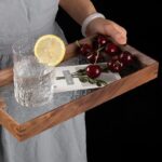 Ce plateau n’est pas qu’un simple accessoire ; c’est une pièce maîtresse qui raconte une histoire. Le jeu de lumière sur son verre texturé et la noblesse de son bois créent une ambiance accueillante et sophistiquée, transformant chaque service en un rituel élégant et chaque espace en un havre de paix visuel.