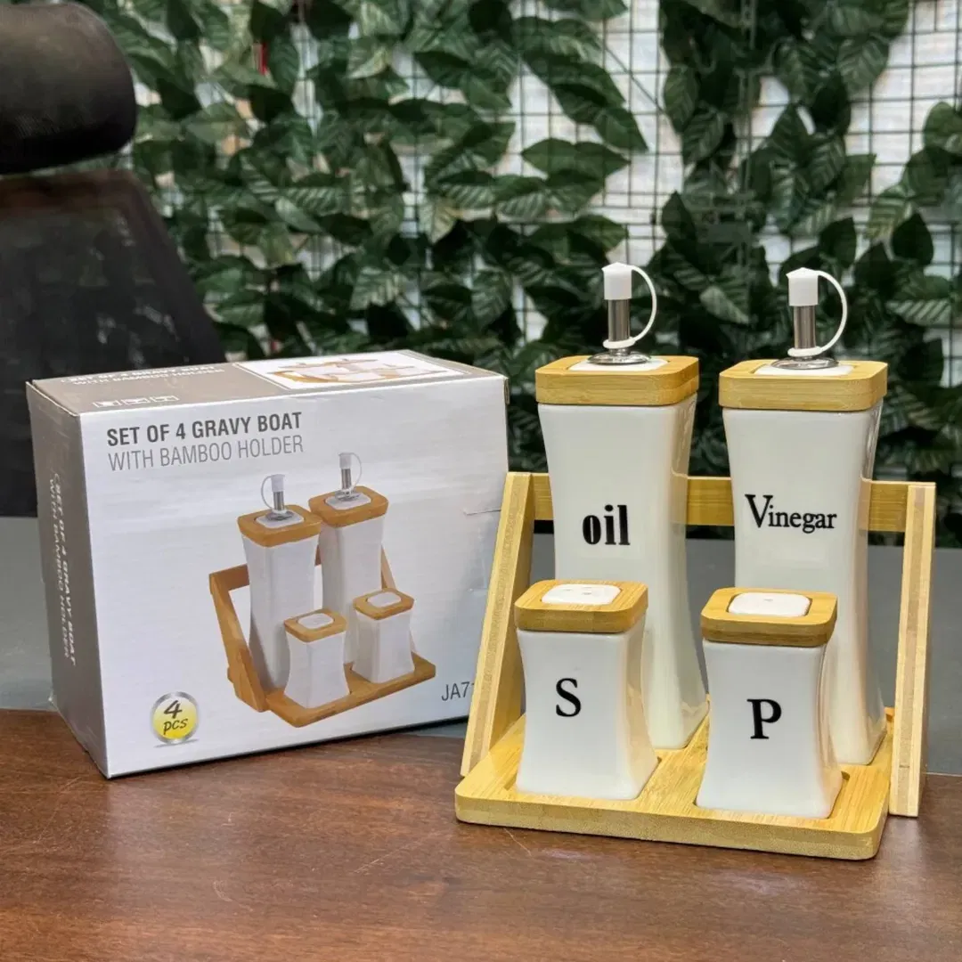 Apportez une touche d’élégance naturelle et de praticité à votre cuisine ou à votre table avec ce set de 4 contenants en céramique avec support en bambou. Conçu pour allier esthétique et fonctionnalité, ce kit complet est idéal pour organiser et présenter vos condiments essentiels : huile, vinaigre, sel et poivre.