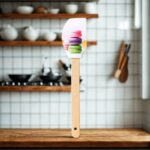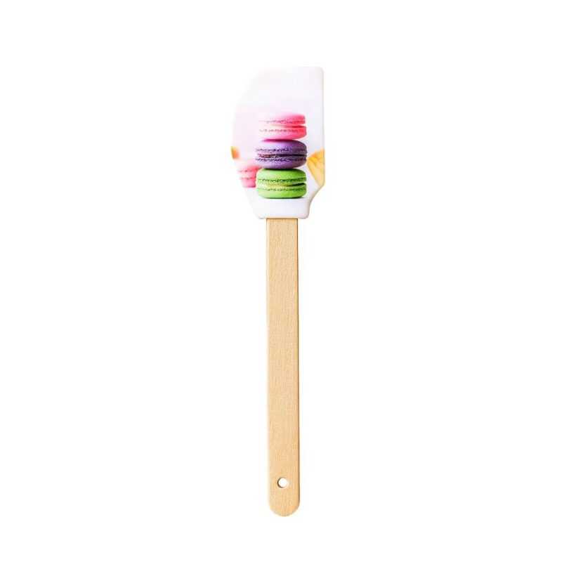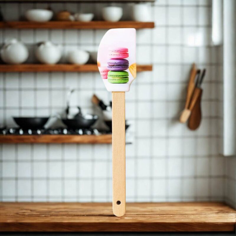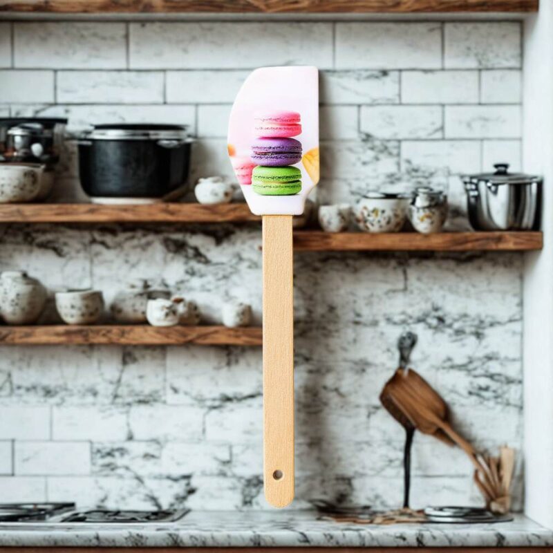 Ajoutez une touche de gourmandise et de couleur à vos préparations avec cette spatule de cuisine en silicone alimentaire, décorée de jolis macarons ! Son manche en bois naturel offre une prise en main confortable et esthétique, idéale pour les passionnés de pâtisserie.